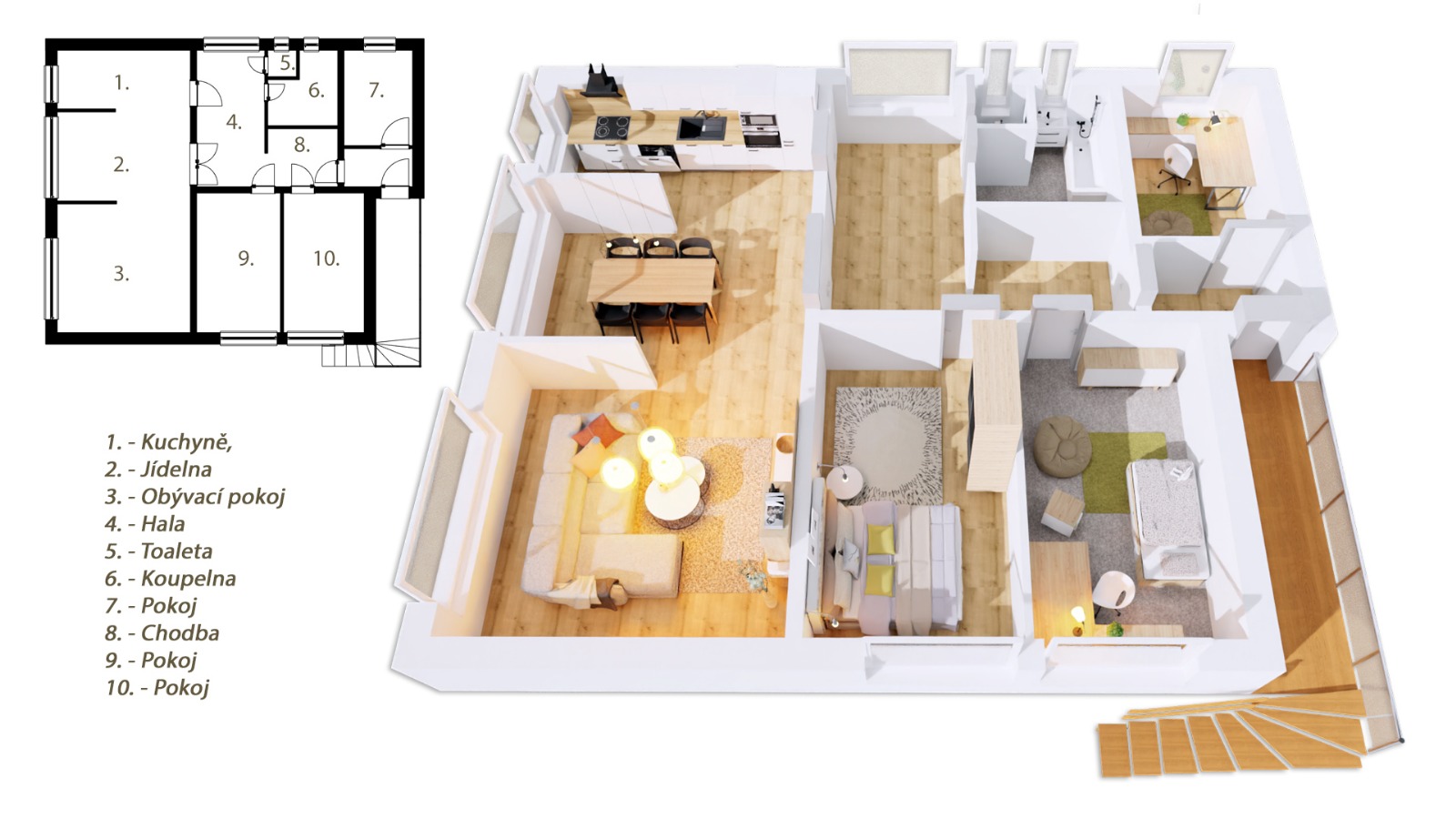 Do patra vede samostatný vchod. Zde je přístup z prostorné chodby s vestavěnými skříněmi do tří pokojů — ložnice a dva pokoje, které lze využít jako dětské, nebo jeden jako pracovnu / šatnu. Chodba sama může sloužit jako pracovní koutek či malá relaxační zóna. Koupelna je menší, ale dobře řešená: vejde se vana, umyvadlová skříňka, pračka i sušička. WC je v patře samostatné.